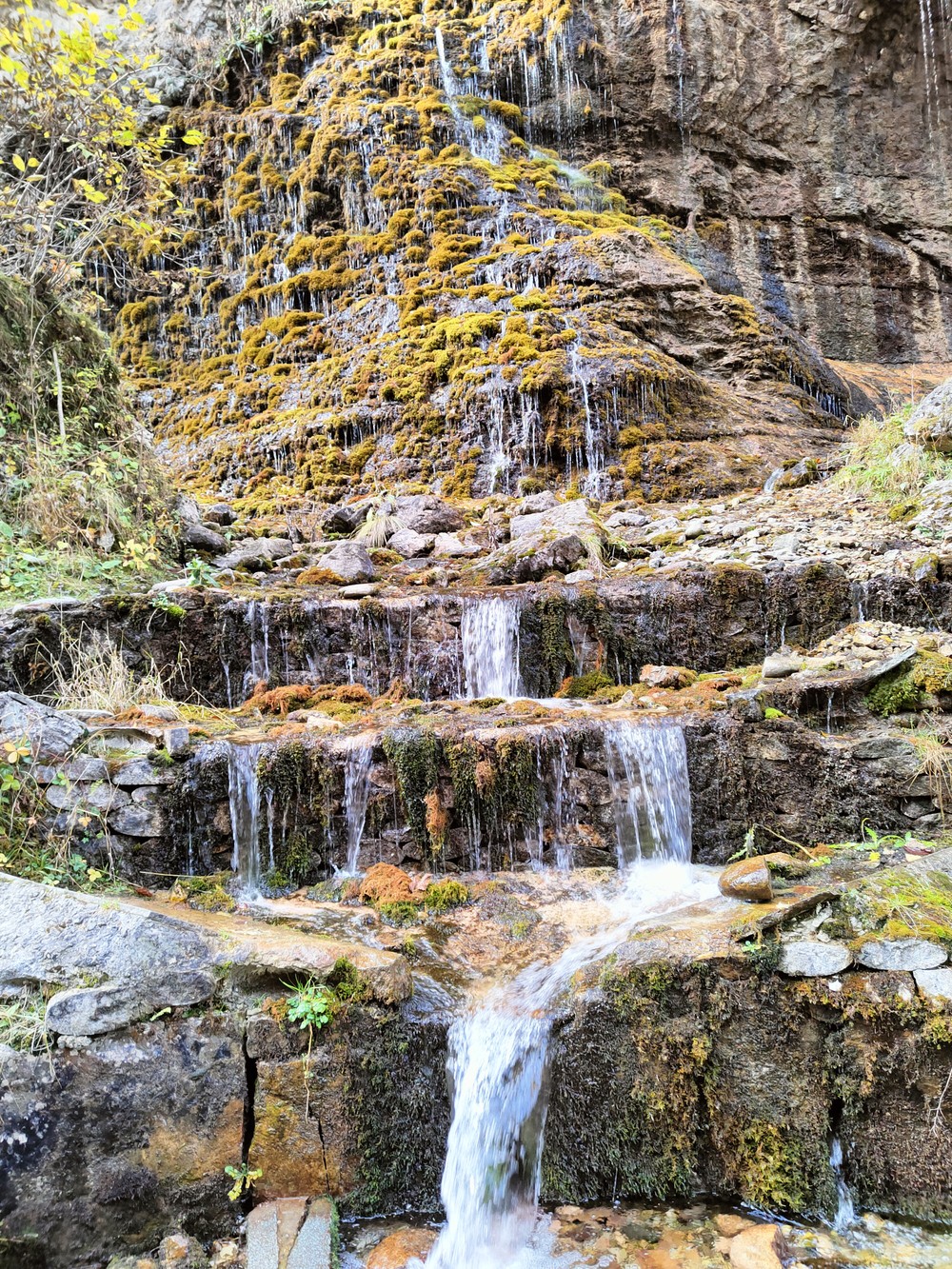Такое название он получил благодаря пушистому мху, по которому стекают ручейки водопада. Подножье выложено ступеньками — по ним вы сможете подняться. А ещё здесь непременно стоит отведать безупречно чистую воду — она вытекает прямо из скалы.