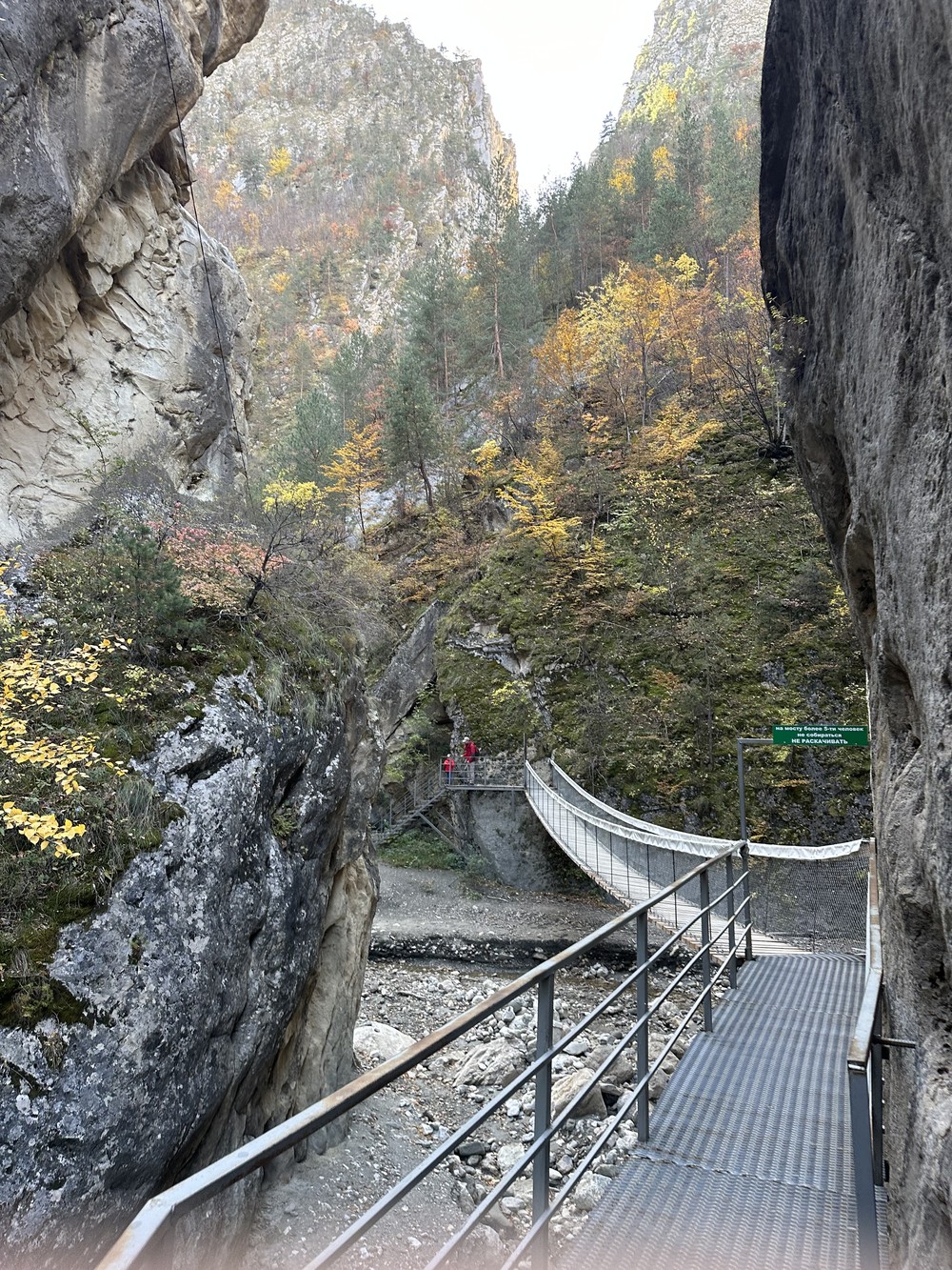 Глубокое ущелье с отвесными сланцевыми стенами. Здесь легко забыть, что вы на Кавказе — пейзаж будто бы перенесён из Исландии. Свет ложится на скалы под углом, который фотографы особенно любят.