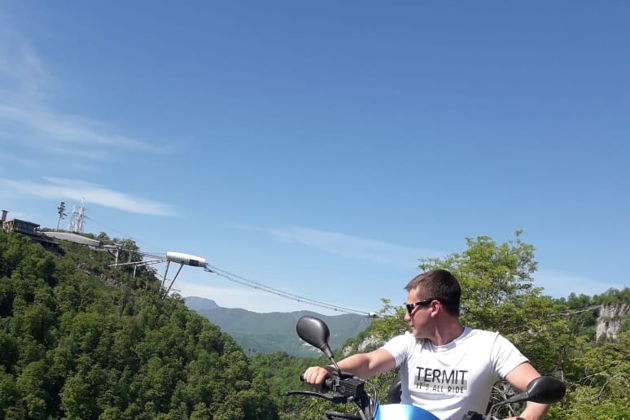 Едем дальше и еще выше в горы. Заедем в огромный каньон, сделаем пару фото и снова в гору. Доезжаем до смотровой площадки, откуда открывается вид на русло реки Мзымта, Черное море, скалы и форелевое хозяйство, а также наблюдаем как смельчаки прыгают с самого длинного пешеходного моста в мире «Скай-Парка».