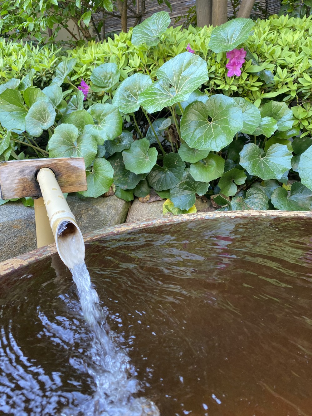 После прогулки вы отправитесь к природному горячему источнику — онсену. Это общественные минеральные ванны на открытым воздухе в саду среди камней и цветов. Вы насладитесь шёлковой ванной для нежности кожи, газированной от усталости, с токами для снятия боли в суставах и пояснице и другими.