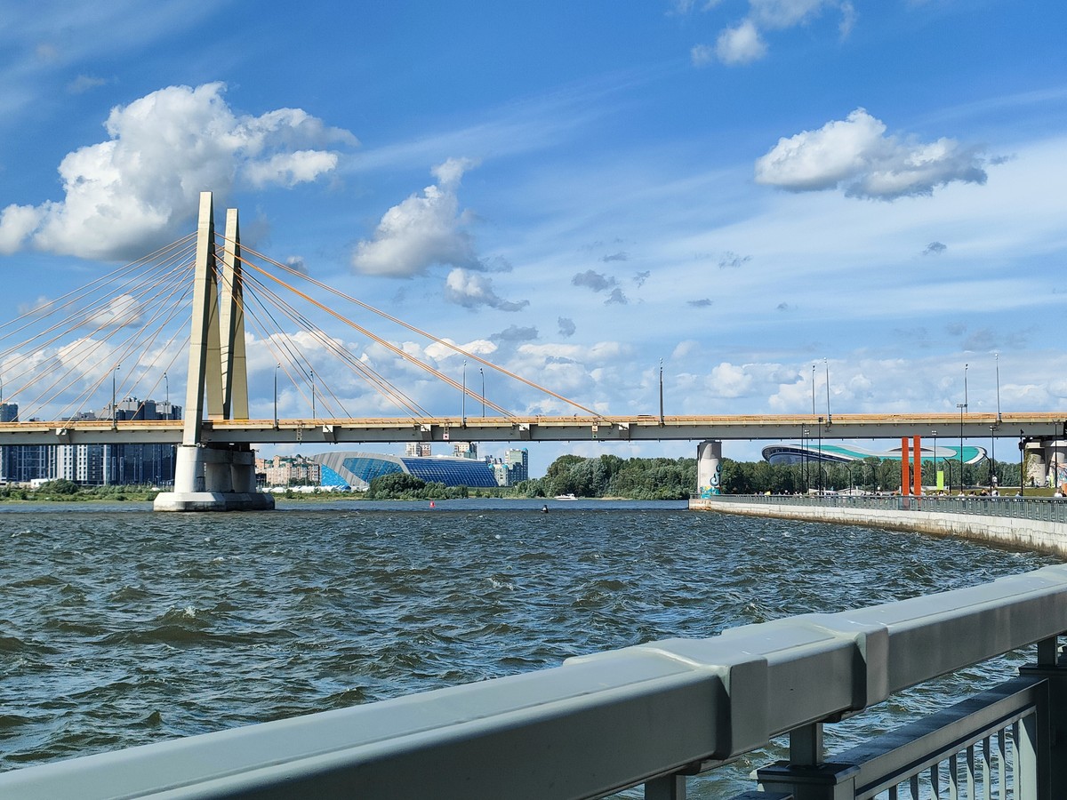 - Панорамный вид на Казанку на высоком берегу рядом с Национальной библиотекой. В 2024 году здесь построили парк «Елмай», с которого открывается прекрасный вид на мост Миллениум
