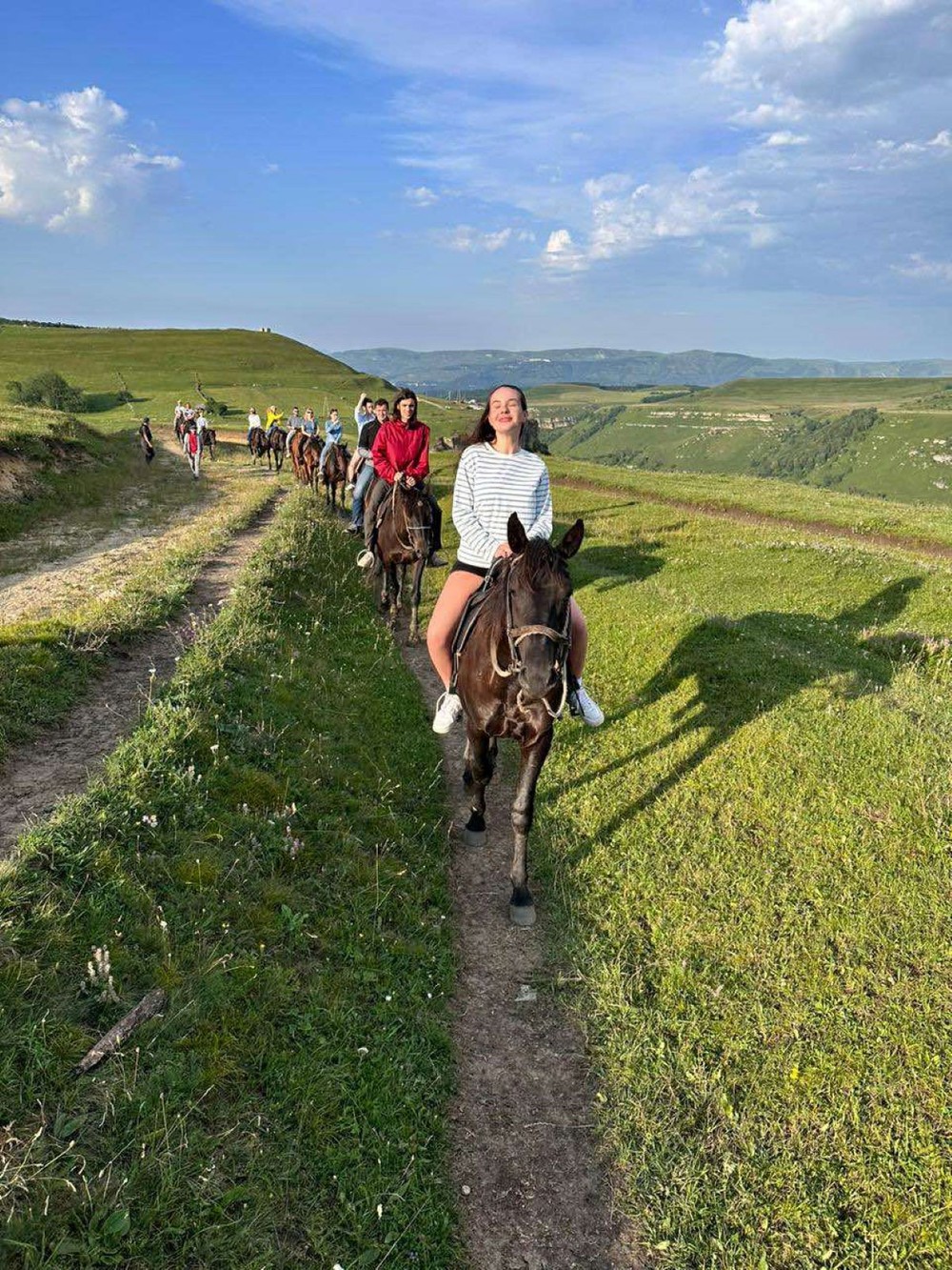 Ооо это было лучшее апрельское приключение! За время в отпуске мы съездили на несколько экскурсий, наблюдали много красивых видов, но поездка на лошадях оставила самые яркие воспоминания. Во первых - инструктор: все объяснил, помог, успокоил, ехал рядом с нами и наблюдал, что все ок. Знаете, это как наставник — он не корректировал в каждое наше движение, но все точно знали: он видит ситуацию и пока он рядом, никто здесь с горы не свалится)) Иногда даже можно было радостно скакать рысью. Из бонусов - песни, стихи и фирменное «юхууу», которое раздавалось эхом по ущелью. Второе - кони. Спокойные, адекватные, чувствующие наездника. Каждый знает свое место в строю, каждый камешек под копытом. Поэтому даже если затупишь в управлении, конь сам все сделает)) Третье - виды. Многие местные говорили, что есть 1000 локаций лучше, но я как турист, необременный опытом жизни в этих кроях, скажу, что в 15 минутах езды от центра Кисловодства это лучшая локация. Вокруг - деревни и бескрайняя природа. Проезжая на коне по краю ущелья, когда солнышко освещает путь, а ветер гуляет в волосах, я точно не думала «ой, что-то не то». И, конечно, доехав до точки «х» на маршруте, нам дали пофоткаться. Без спешки дали самого невозмутимого коня, каждую по очереди посадили, обеспечили временем, чтобы сняться со всех ракурсов. Ну, Ляпота. Одним словом - кайф! Спасибо, что ты вы делаете свое дело))