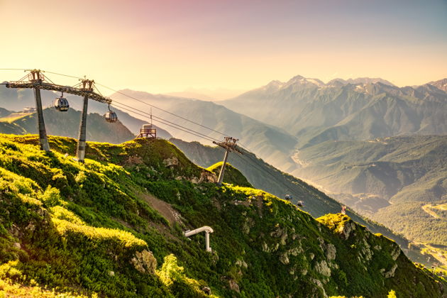 Подъем на Розу Хутор, 2320 метров (там больше мест, где погулять пешком, есть еще бесплатная канатная дорожка открытого типа, которая катается по кругу вверх и вниз метров на 500 общей сложностью), всего 3-4 пересадки на канатной дороге на фуникулерах закрытого типа — для тех, кто любит покруче;