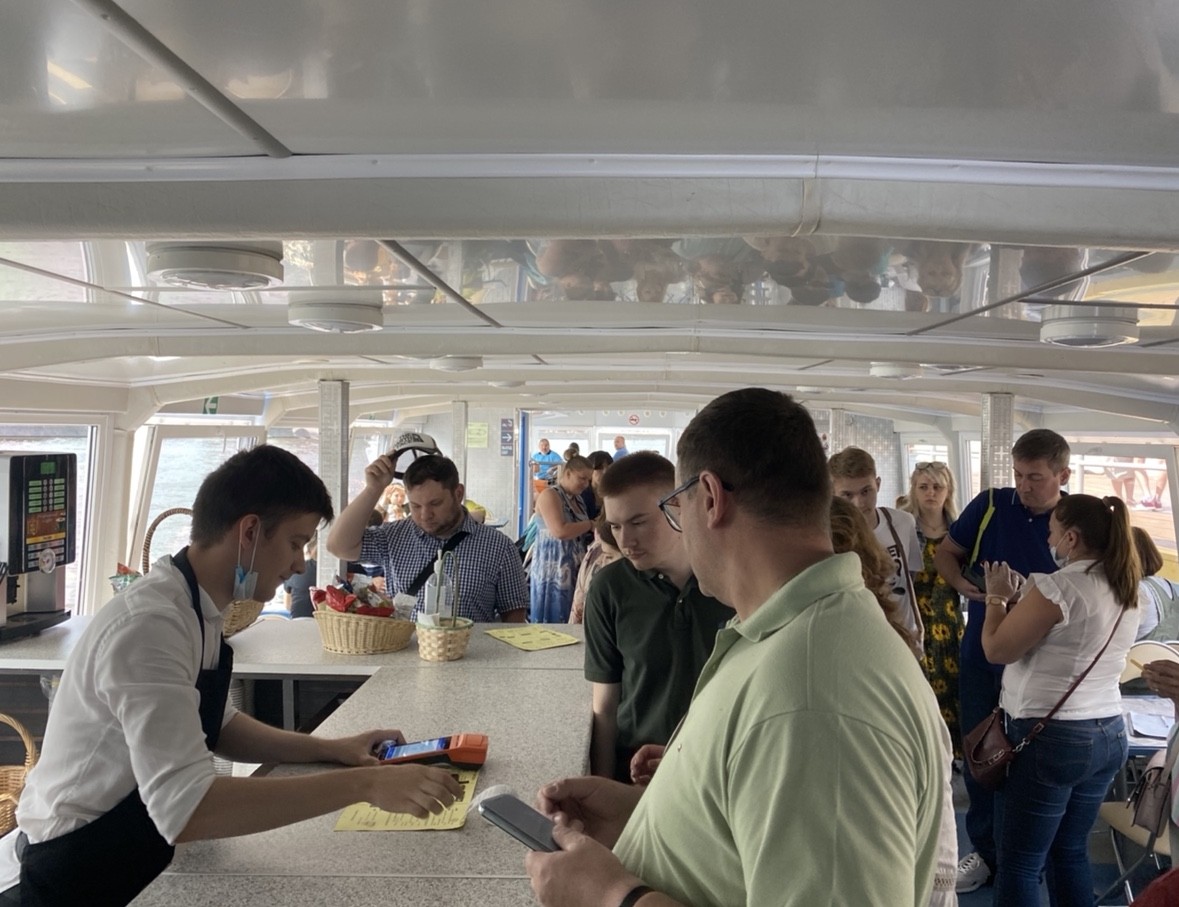 - Прогулка проходит на теплоходе «Виктор Потапов» или «Москва-46» вместимостью до 150 человек. На борту есть аудиосистема, уборная, кафе-бар и ресторан. Рассадка свободная