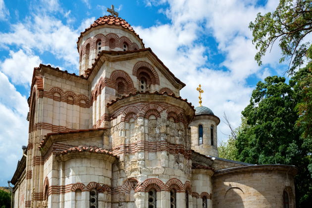 Конструкция укреплена колоннами, венчаемыми византийско-коринфскими капителями. В кладке стен восточной части храма использованы чередующиеся ряды белого камня и красного кирпича: такой приём характерен для Византии. К слову, этот «слоёный пирог» не просто эффектно выглядит, но ещё и выполняет антисейсмическую функцию, что помогло зданию дойти до наших дней.