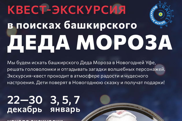 Два часа экскурсии пройдут в атмосфере радости и чудесного настроения! Ищем башкирского Деда Мороза в Новогодней Уфе, решаем головоломки и отгадываем загадки волшебных персонажей, знакомимся с Уфой и традициями празднования Нового Года.