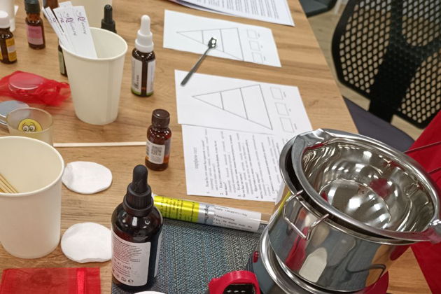 • При проведении мастер-класса для каждого участника предусмотрены ароматизированные блоттеры для арома-игры, а также все необходимые ингредиенты и инструменты для изготовления твердых духов (стерилизатор, воск, твердые и жидкие масла, эфирные масла, витамин Е-антиоксидант, стабилизатор, баночки для духов).