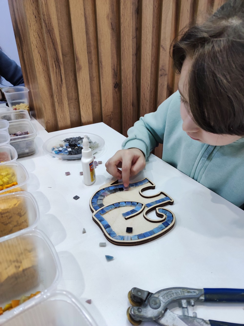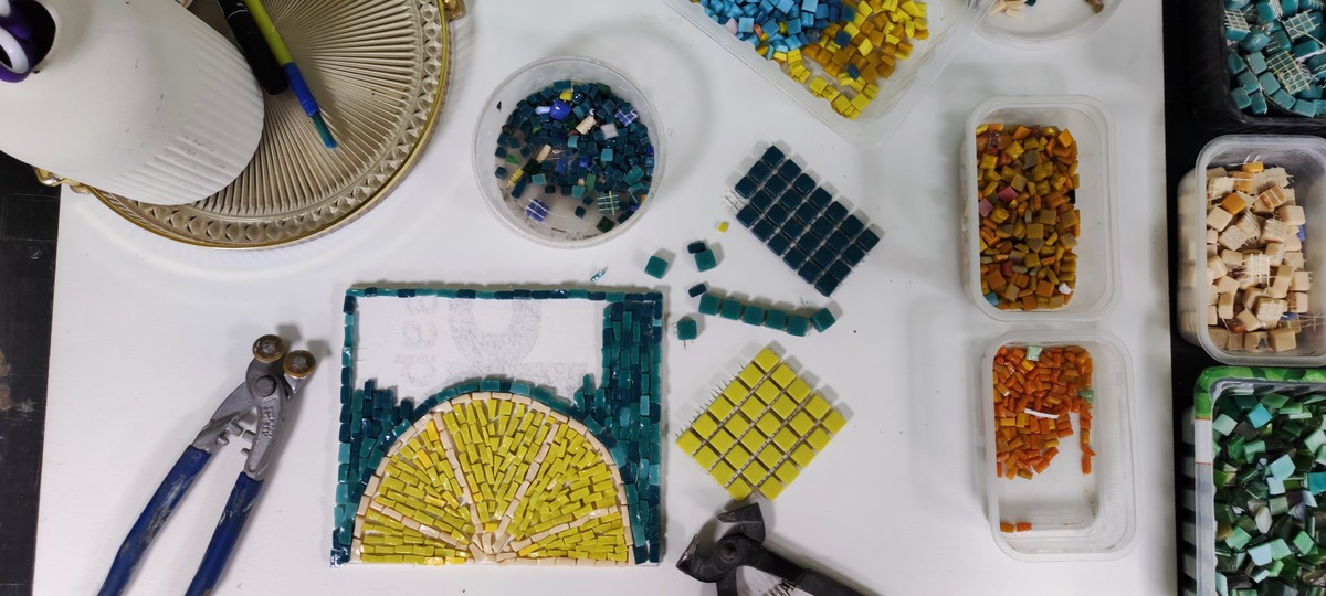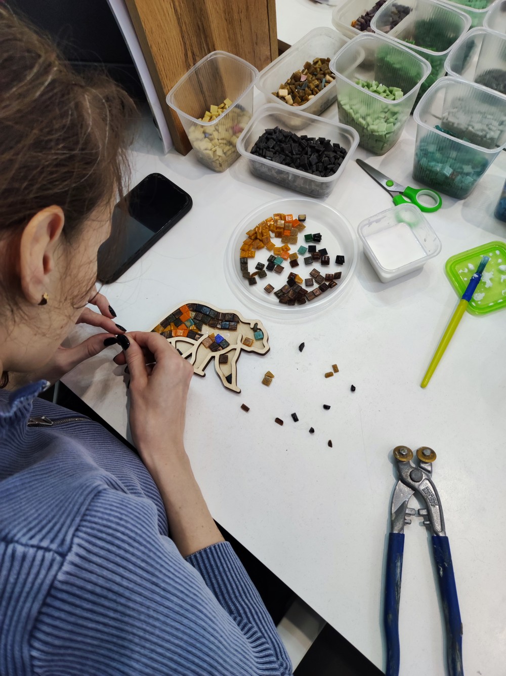 Под нашим руководством вы сделаете небольшое панно — выберете форму, заполните её цветными кусочками стекла и фактурами. В рабочем пространстве студии есть необходимые инструменты и материалы: элементы из стекла, смальты, натурального камня, зеркала, клей и затирка.