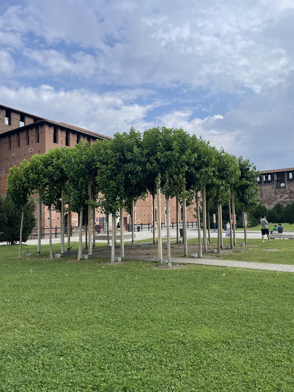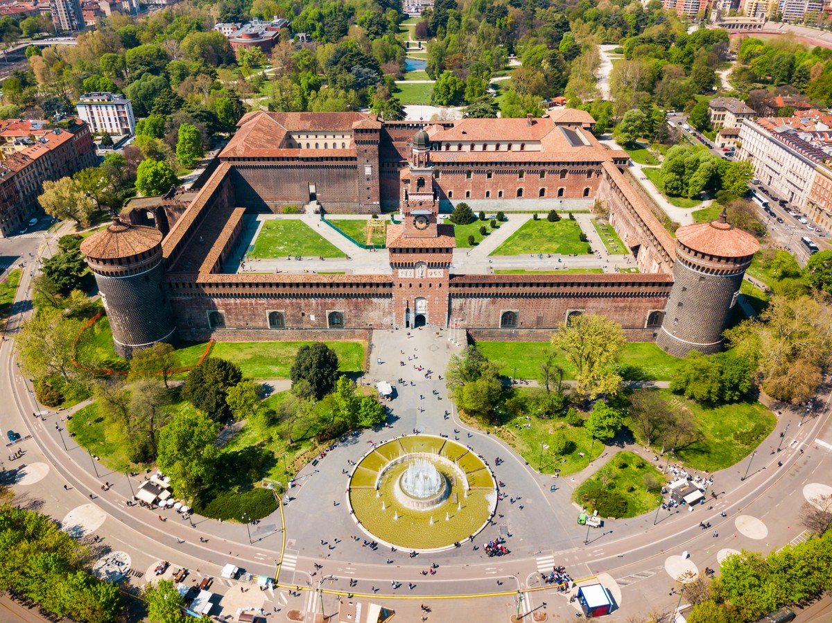 Начнём экскурсию с прогулки во внутреннем дворике замка Сфорца (Кастелло Сфорцеско). Осмотрим инсталляцию из 16 тутовых деревьев, которая в точности воспроизводит пропорции росписи Леонардо в Зала делле Ассе. В самом музее обратим внимание на скульптурную группу «Пьета Ронданини» Микеланджело — грандиозное воплощение скорби в камне. В пинакотеке замка осмотрим коллекции произведений Андреа Мантенья, Филиппо Липпи, Лоренцо Лотто, Антонио Корреджо.