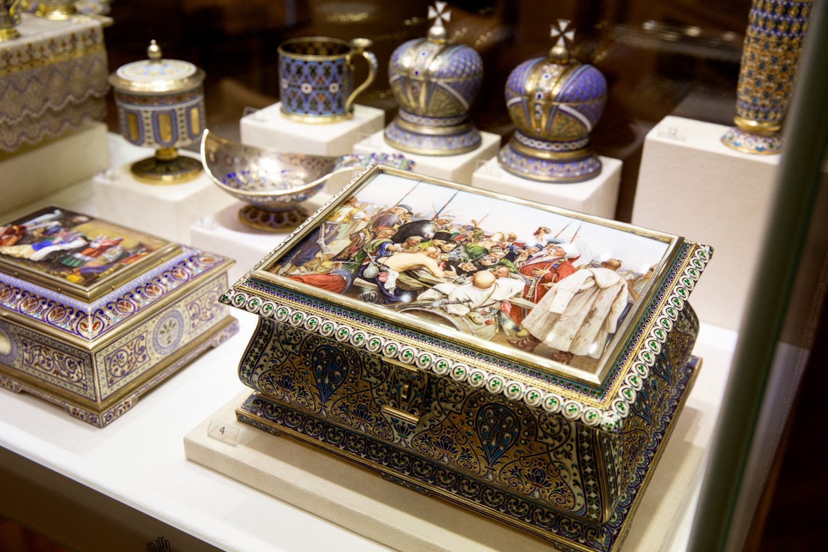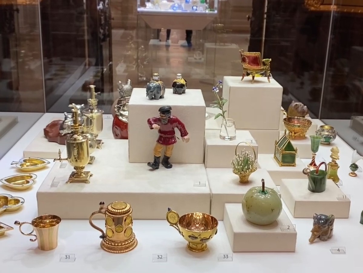 - А также рассмотрите кабинетские подарки Его Императорского Величества, каменный зоопарк Фаберже и предметы питейной традиции.