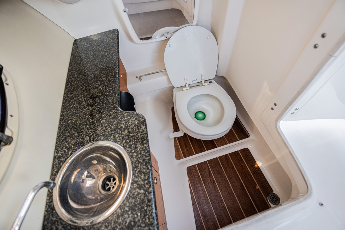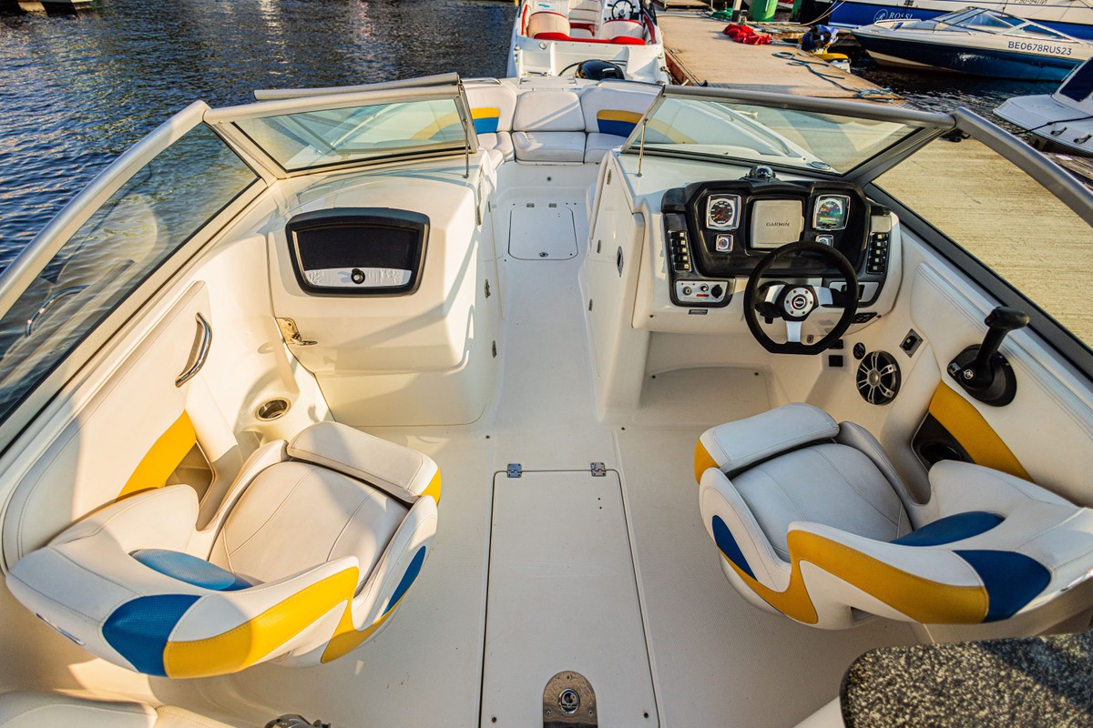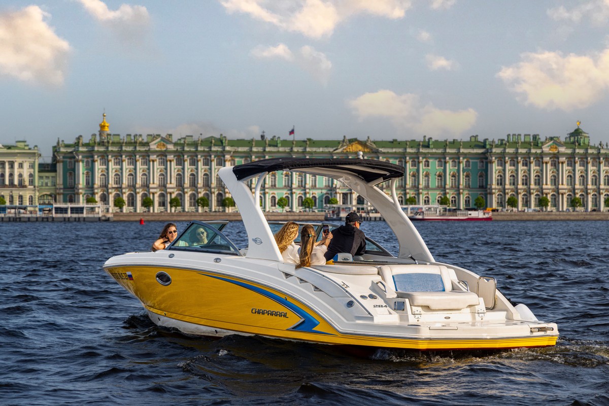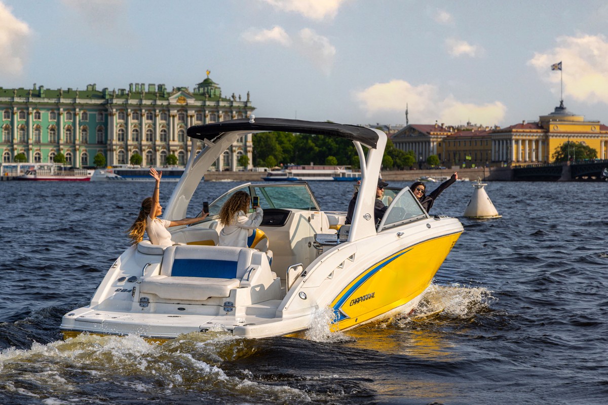 - Катаемся на комфортабельном катере с кожаными диванами в носовой и кормовой части, столом с подстаканниками, спасжилетами, биотуалетом, мощной аудиосистемой — будет громко и весело!