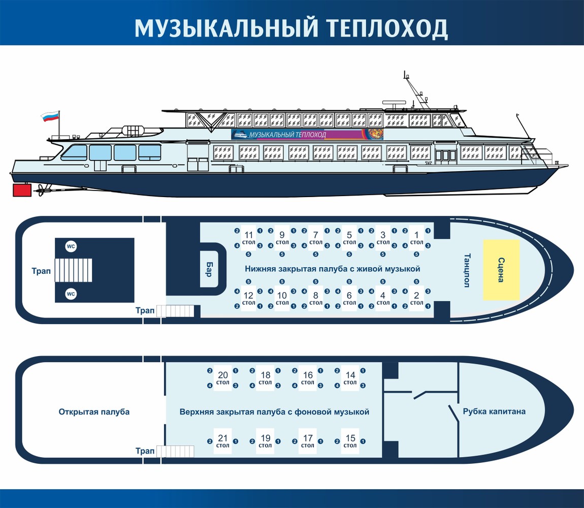 Вы расположитесь за столом на одной из палуб теплохода, который вмещает до 100 человек. Перемещаться по судну можно без ограничений: лакомиться блюдами и напитками за своим столиком, танцевать на нижней палубе под живую музыку, слушать фоновые мелодии на верхней или дышать ночным воздухом на открытой террасе, любуясь достопримечательностями города.
