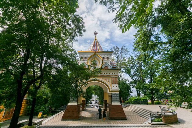 От набережной мы оправимся на прогулку по Адмиральскому скверу и полюбуемся на Арку цесаревича Николая, возведенную в конце XIX столетия. Она была установлена в честь прибытия в город наследника российского престола и представляет собой эффектный памятник русского зодчества. Далее мы заглянем в старый дворик ГУМа и пройдемся по улице Светланской до пешеходной зоны ул. Адмирала Фокина. В народе ее часто называют «владивостокский Арбат». Здесь можно найти много кафе, небольших магазинчиков, а также исторических зданий постройки XIX – начала XX века.