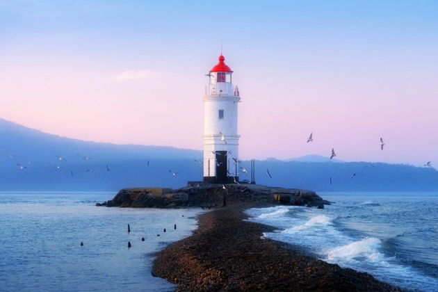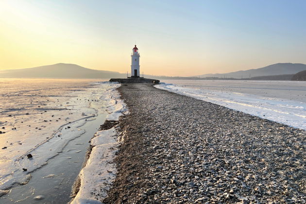 По Золотому мосту над бухтой Золотой Рог мы проедем мимо Приморской сцены Мариинского театра и далее по полуострову Шкота к Токаревскому маяку — одному из пяти маяков Владивостока…