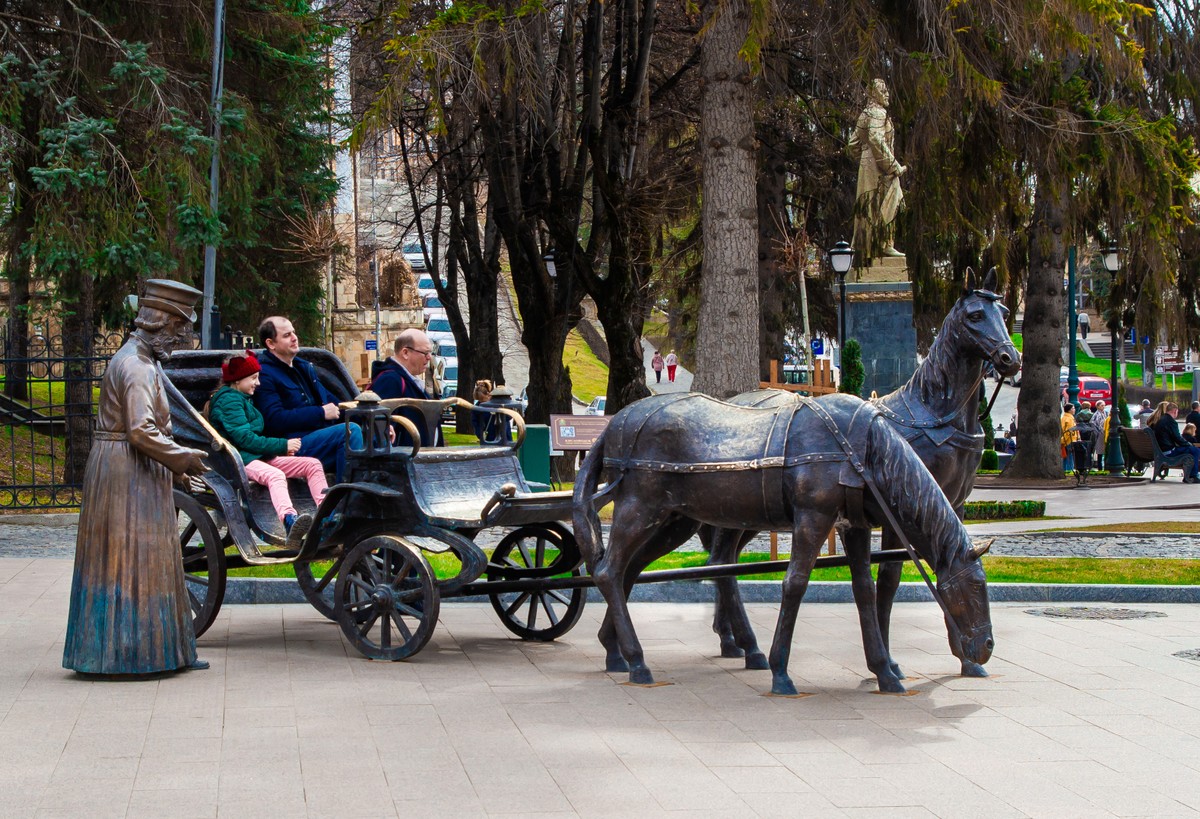 Улица Ленина. Прогуляемся по пешеходной части к новому бювету питьевой воды и продегустируем разные виды Нарзана. Сделаем фото у грандиозных скульптур : «Подписание рескрипта Александром I» и в бронзовой карете, запряженной лошадьми. Улыбнемся скульптуре «Писающей собачки» и каменным барашкам, пасущимся на лужайке.