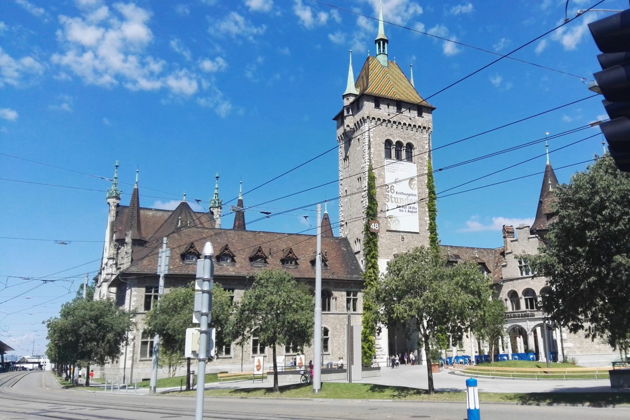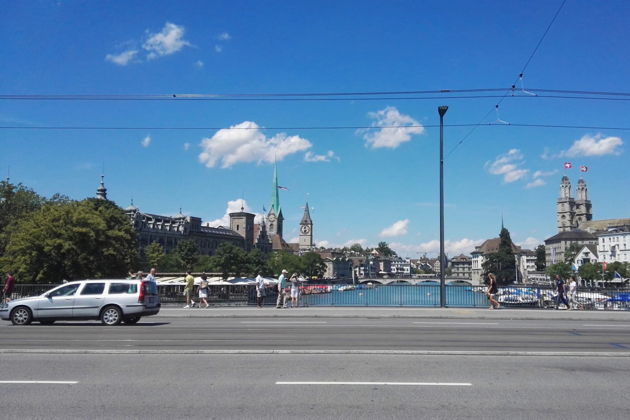 Живописный городской пейзаж центра Цюриха открывает панораму исторических зданий на фоне синих вод реки Лиммат. В центре внимания — величественный кафедральный собор Гроссмюнстер с двумя узнаваемыми башнями, украшенными флагами Швейцарии. По соседству возвышается церковь Фраумюнстер с изящным зелёным шпилем. Берега Лиммата обрамлены старинными домами, уютными набережными и мостами, создавая гармоничную атмосферу старого европейского города, где история и природа сливаются в едином живописном ансамбле.
