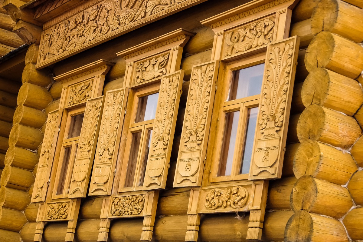 - Рассмотрим маленькие деревянные домики, сплошь покрытые глухой городецкой резьбой и ажурной накладной на улице Рублёва
