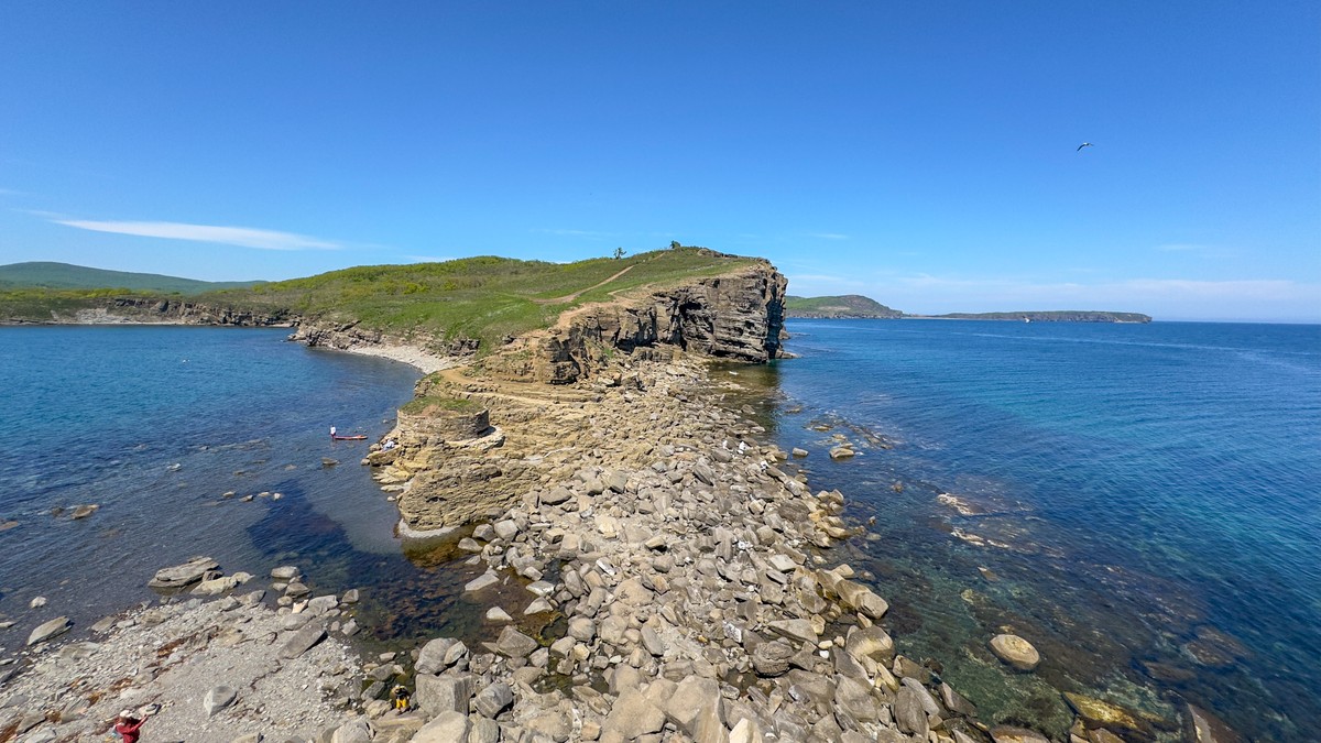 Доберёмся до него по шикарной природной тропе вдоль отвесных скал: вы насладитесь потрясающими видами на Японское море и увидите, как гнездятся дикие бакланы. Оказавшись на крайней точке мыса, устроим пикник и искупаемся в чистой бирюзовой воде. А если повезёт, познакомимся с лисицами, которые выпрашивают еду у туристов.