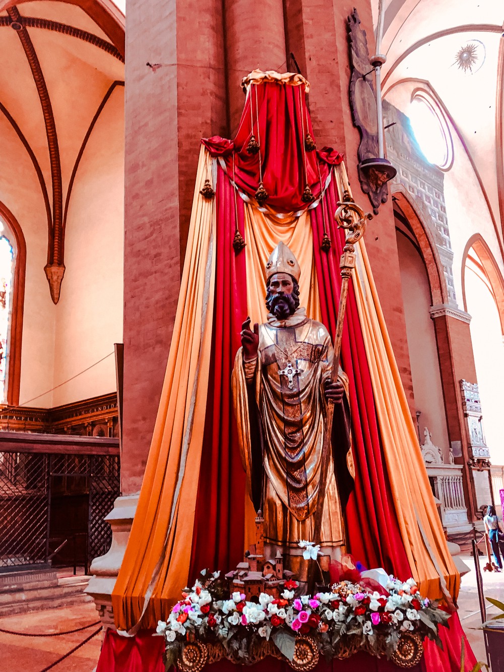 - Зайдём в базилику Сан-Петронио. Здесь поговорим о «Божественной комедии» Данте Алигьери, я расскажу о скандальной фреске 15 века, изображающей круги ада, какое отношение к Болонье имеет сестра Наполеона Элиза и какой календарь с точностью показывает дни равноденствия и солнцестояния.