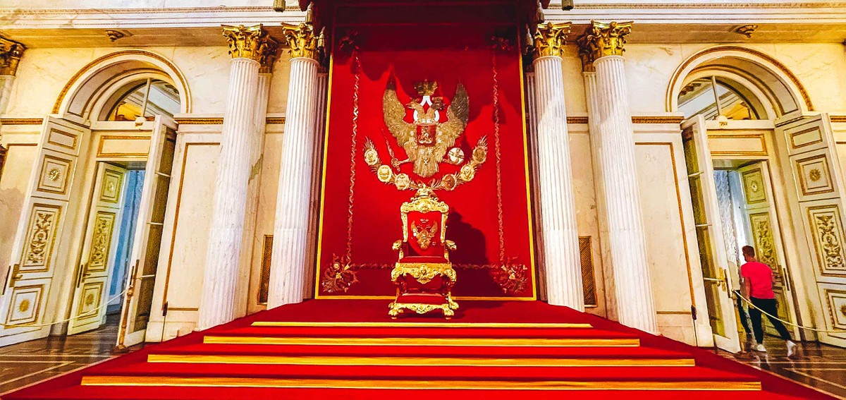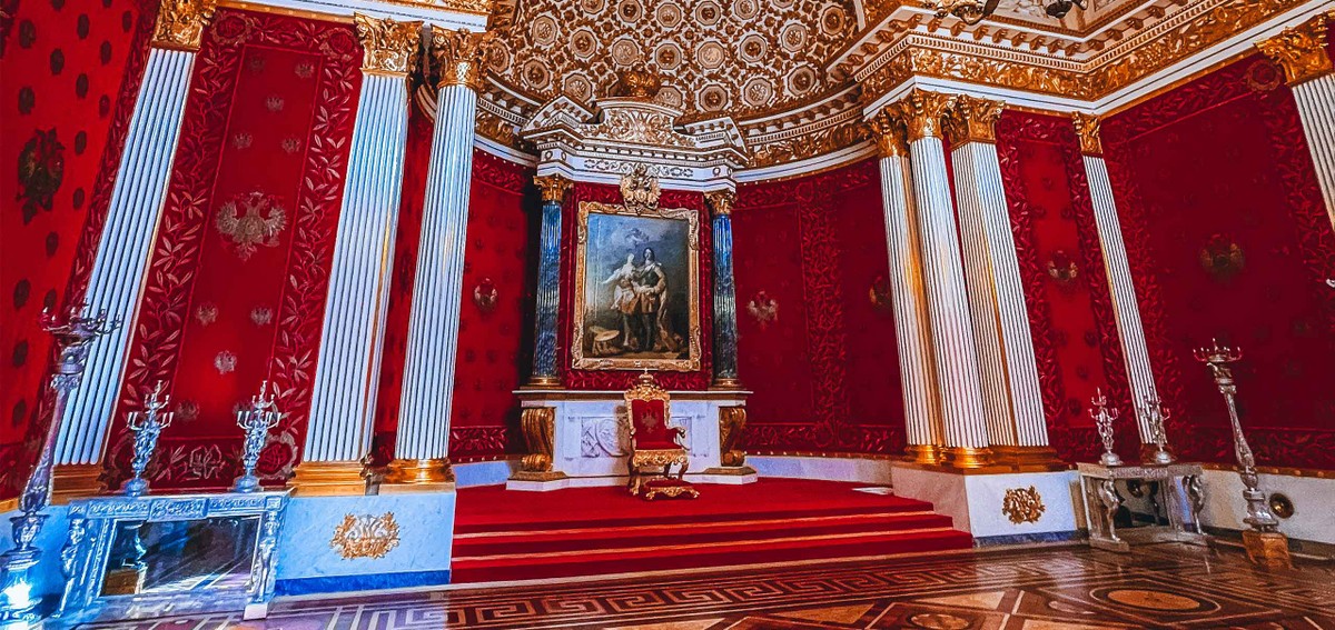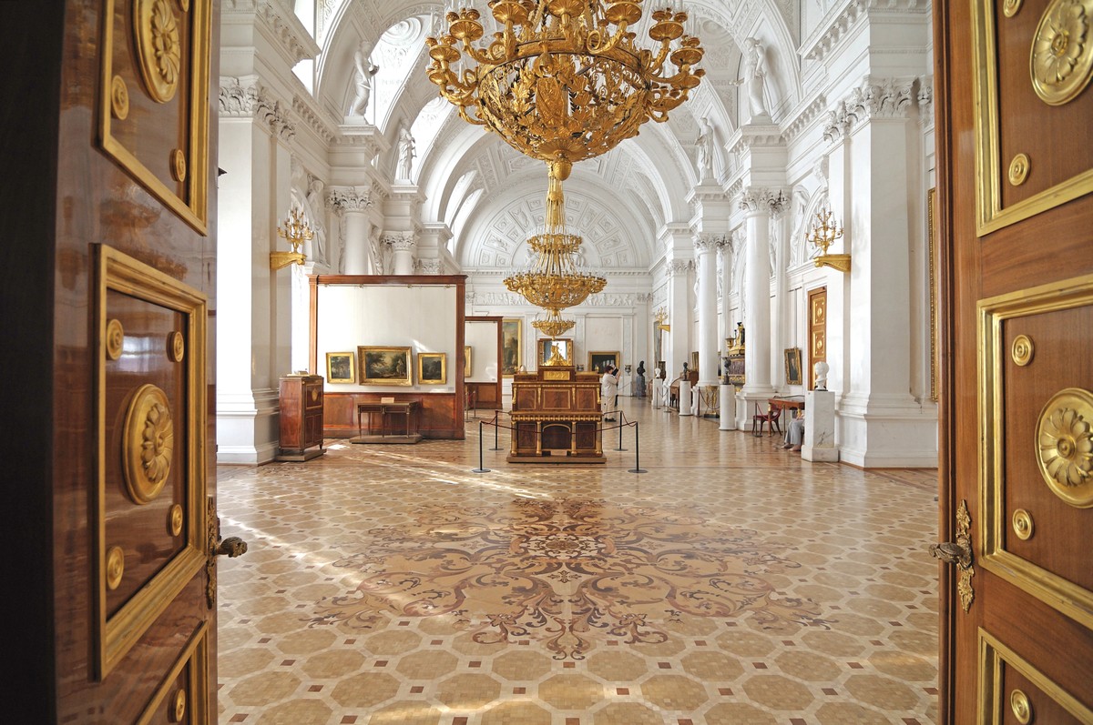 - калейдоскоп парадных залов — украшенную полудрагоценным камнем Малахитовую гостиную, сияющий золотом Гербовый зал, Концертный зал с лепным декором, грандиозный Георгиевский, где проходили императорские церемонии