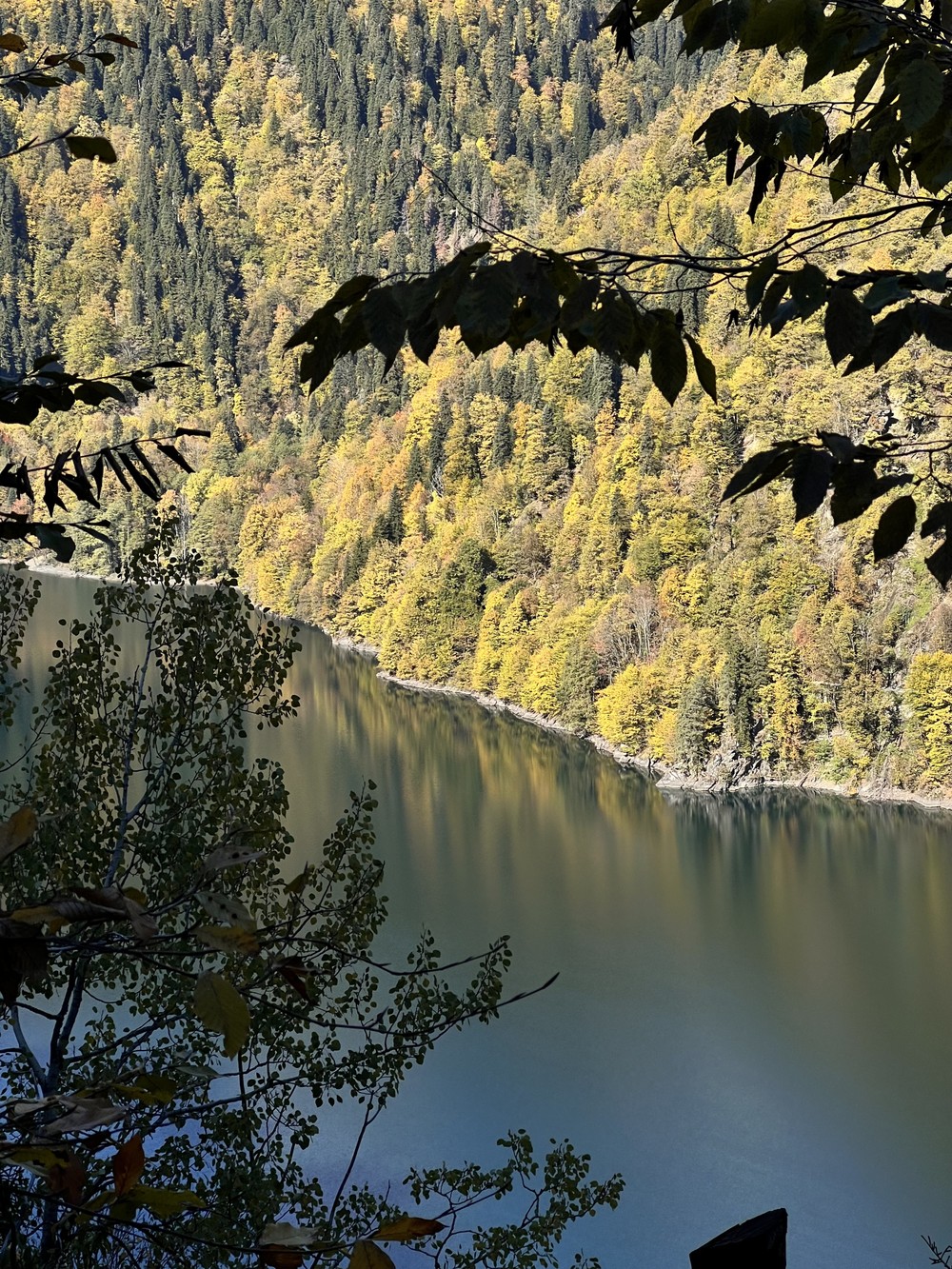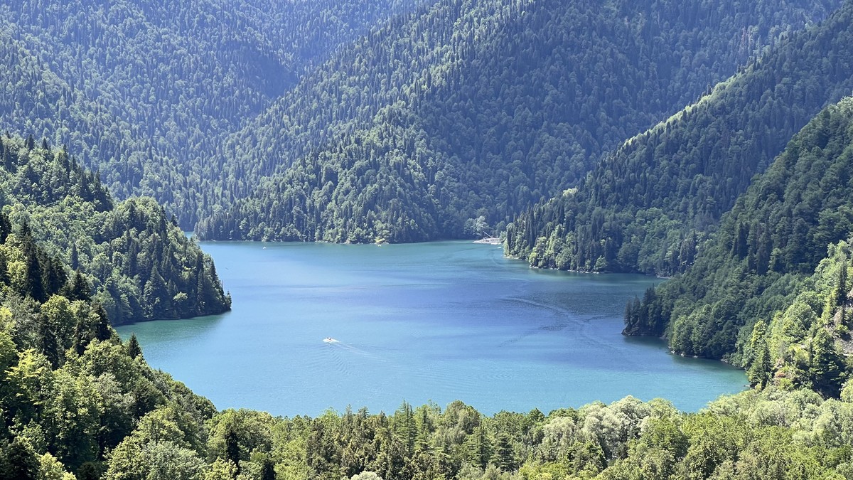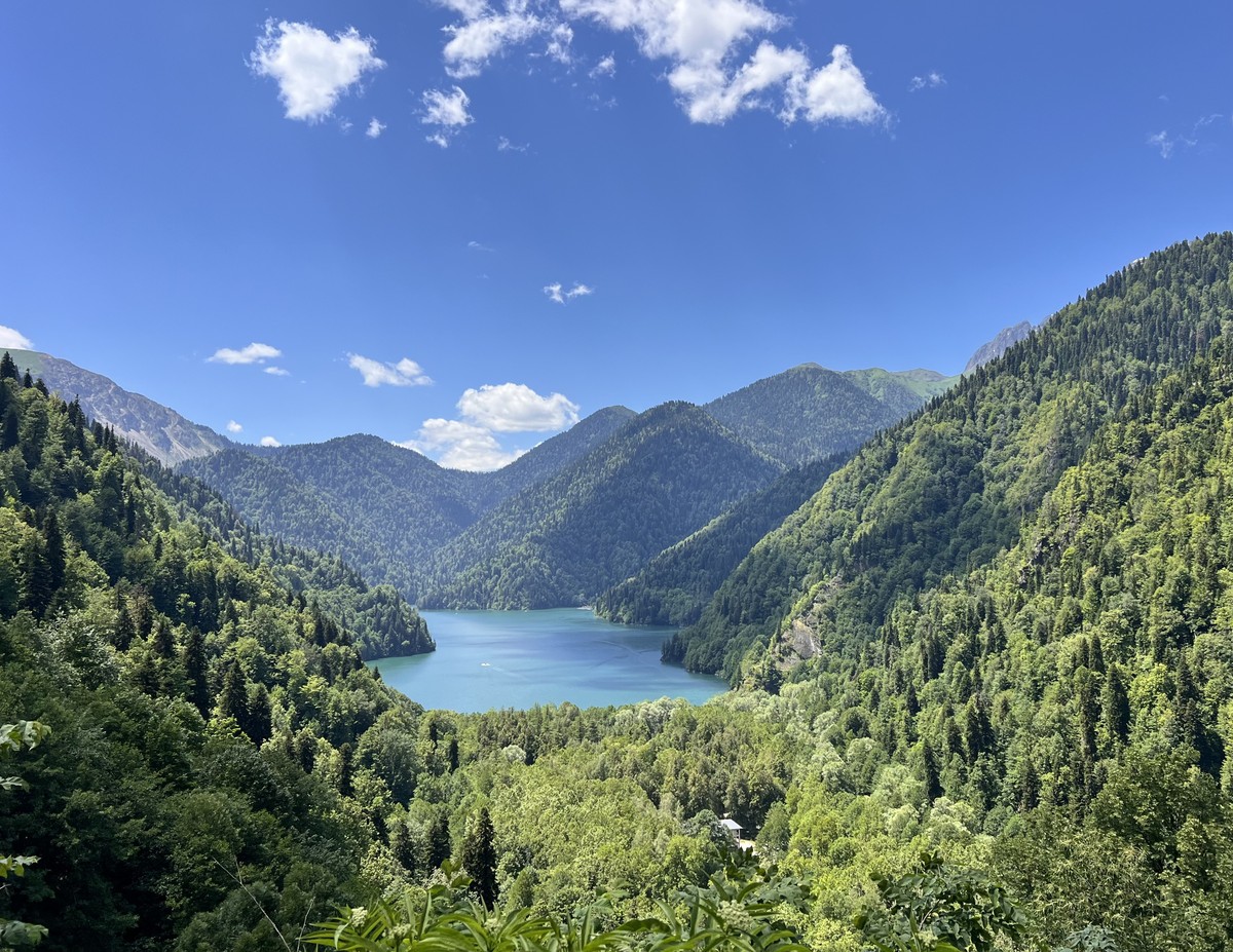 Карстовое озеро небесного цвета, окружённое скалами. Возможность пролететь над рекой Бзыбь на тарзанке (по желанию).