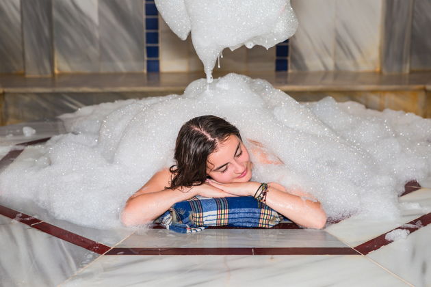 По прибытии в хаммам Аджемоглу вы сможете воспользоваться услушами одной из редких смешанных бань в Турции, где пары, семьи и друзья могут наслаждаться купанием вместе. Вы будто бы вернетесь во времена Османской империи. А еще сможете омолодиться благодаря глиняной маске для всего тела, пенке и скрабу (кесе). После процедуры кесе насладитесь традиционным ритуалом умывания пузырьками.