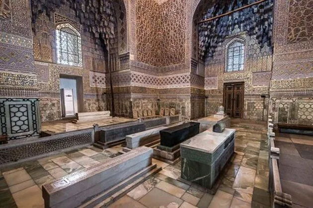 Следующим пунктом нашей экскурсии станет Мавзолей Гур-Эмир — усыпальница Тамерлана. Этот грандиозный мавзолей XIV века, где покоится Амир Темур и его потомки, впечатляет лазурным куполом, изысканной резьбой и ощущением величия эпохи Тимуридов.
