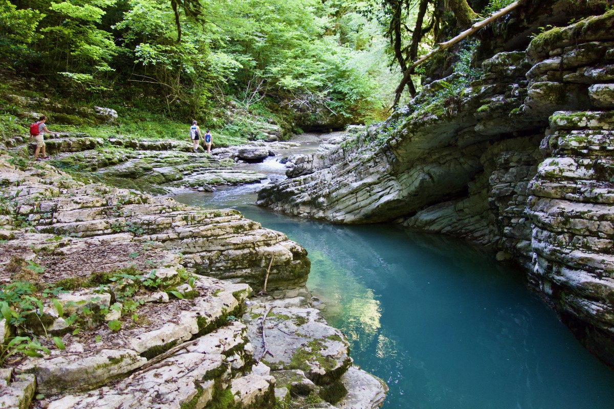 Мы прогуляемся по интересному нетуристическому маршруту, проложенному по руслу реки Псахо. Летом каньон не такой полноводный, как в другие времена года, поэтому идти можно прямо по руслу — но лучше это делать в коралловых тапочках или сандалиях.