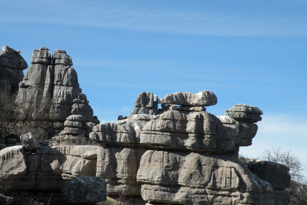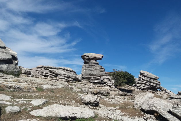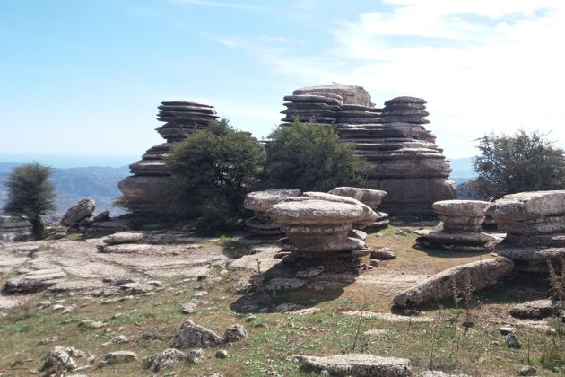 Природа в заповеднике Эль Торкаль весьма необычная. Из-за сильной эрозии известняковые скалы, бывшие 200 миллионов лет назад шельфовым дном Океана, приняли такие причудливые формы, что фантазия сама просыпается в нас и мы принимаемся наперебой придумывать названия этим творениям Природы. Так у этих скал появляются свои собственные названия! А вот и кое-что любопытное встретилось прямо под ногами – отпечаток в скале, которую оставил живший сотни миллионов лет назад моллюск аммонит огромных размеров. Здесь Естественную Историю, что проходили в школе, видишь воочию. Так и кажется, что пройдешь еще чуть-чуть и найдешь окаменелости древних ящеров и динозавров. Что ж! И такое случается здесь! Ученые всего мира знают эту местность не как туристический маршрут, а как место, где можно сделать много интереснейших открытий о флоре и фауне давно минувших эпох. Недаром, эта местность, всего-то в 11,7 кв. километра, стала первым заповедником в Андалусии, еще в далеком 1929-м году.
