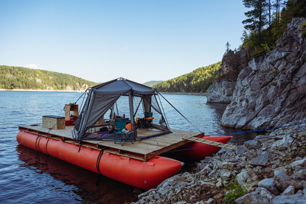 Путешествие на моторном катамаране с просторной палубой 4*9 метров. По палубе можно ходить, лежать-загорать, сидеть в кресле. На палубе установлена палатка-тент, которую мы называем кают-компанией. 6-ти угольная палатка 4*4 метра закрывает от солнца и дождя, со всех сторон по желанию открывается, обзор не загораживается. Есть стол, кресла, газовая плита, чайник. Биотуалет. Спасательные жилеты на каждого пассажира.
