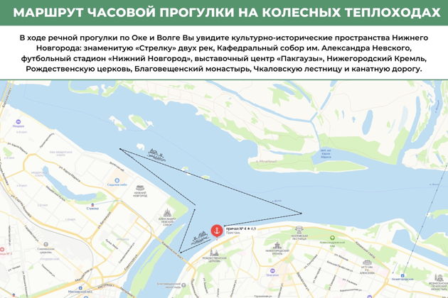 В ходе часовой речной прогулки по Оке и Волге с аудио-экскурсией вы познакомитесь с культурно-историческими пространствами Нижнего Новгорода: знаменитой «Стрелкой» двух рек, Кафедральным собором им. Александра Невского, стадионом «Нижний Новгород», выставочным центром «Пакгаузы», величественным Кремлем, Рождественской церковью, Благовещенским монастырём, Чкаловской лестницей и канатной дорогой.