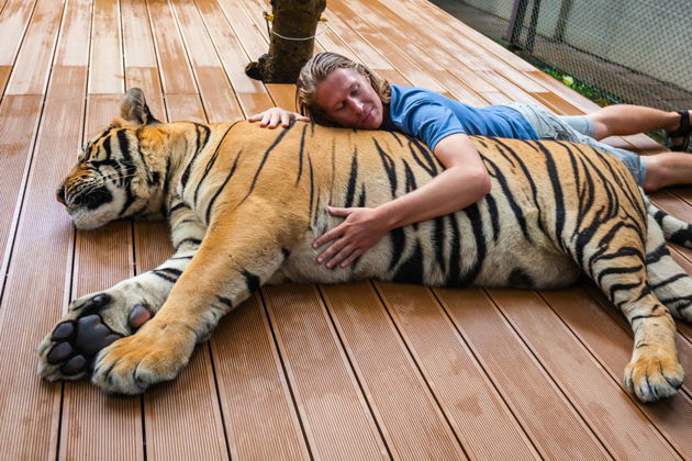Здесь в окружении тропической зелени тигры отдыхают и нежатся в бассейнах. Вы понаблюдаете за прекрасными животными, но главное — сможете зайти в вольеры с тигрятами, обнять их, сделать фотографии и видео. Не переживайте, всё безопасно даже для маленьких детей.