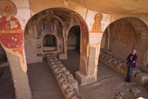 Дальше вас ждет примерно двухчасовой поход на хребет, формально являющийся границей двух стран, прогулка по противоположному склону и спуск по тропе с другой стороны. Во время похода вы осмотрите высеченные в скале помещения древнего монастыря Тетри Удабно с фрагментарно сохранившейся настенной росписью — интересными образцами грузинской средневековой монументальной живописи. А также окинете взглядом открывающиеся сверху виды на равнины соседнего Азербайджана.