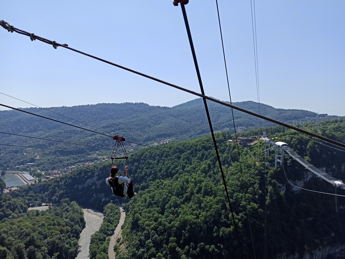 Стихия воздуха. А вот и кульминация нашей программы — Скайпарк! Вы прогуляетесь над пропастью Ахштырского каньона по эффектному подвесному мосту и при желании прокатитесь с ветерком на зиплайне или пощекочете нервы (себе и окружающим), прыгнув в пустоту с высоты 209 м на эластичном канате.