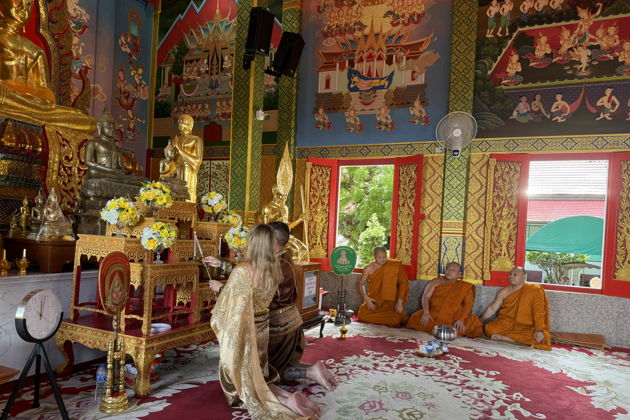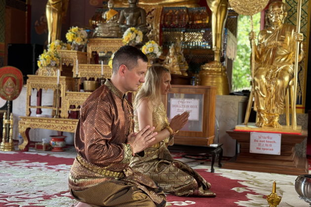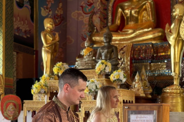 Молодожены наденут традиционные одежды, зажигаются свечи на алтаре, и монах (монахи) дадут благословение.