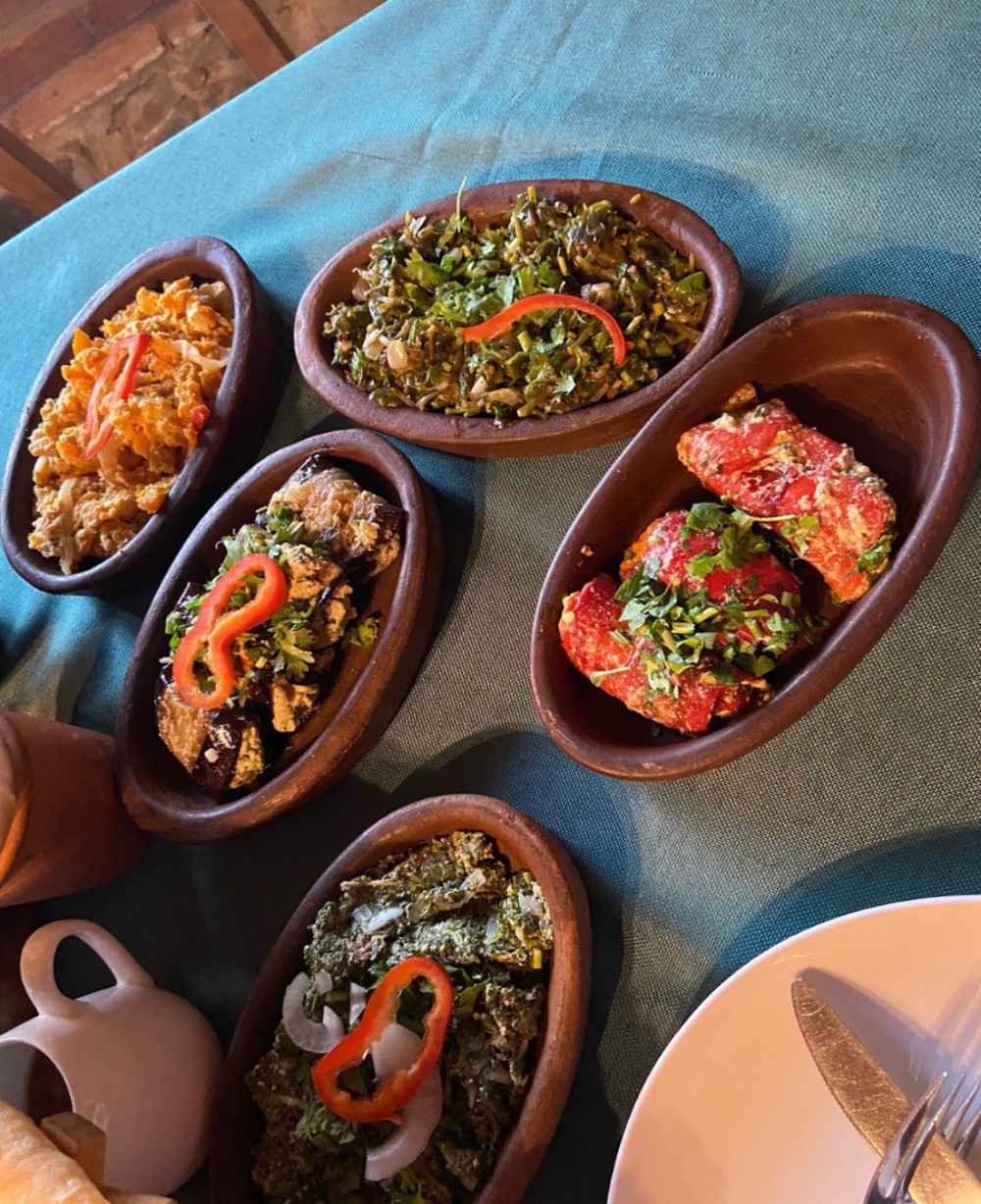 - Холодные и вегетарианские закуски: пхали из шпината, свеклы и моркови (с грецким орехом и приправами), рулет из баклажана с грецким орехом и семенами граната, соус «Ткемали», блюдо из крапивы, грузинский салат, бобы с зеленью и луком.