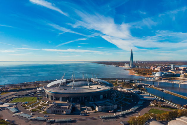 • футуристичный силуэт стадиона «Газпром Арена», принимавшего матчи мирового уровня;