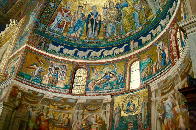 Мозаика IX в.Базилика Санта-Чечилия-ин-Трастевере построенна в IX веке на месте старого сооружения. Папа Пасхалий I рассказывает (в сборнике Liber Pontificalis), как сам поместил мощи и гроб Цецилии в мраморный саркофаг под алтарем новой базилики храма в 821 году. Вы увидите мозаику IX в., которую папа Пасхалий I также заказал с собственным изображением для апсиды нового храма. Вы рассмотрите портик и колокольню, построенные в первой половине XII века и сохранившиеся до наших дней и узнаете, чем отличается колокольня этой церкви от других.