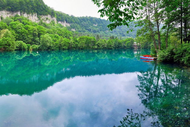 Голубое озеро — следующий пункт нашей экскурсии. Это самое глубокое карстовое озеро на Кавказе, удивляющее не только своим бирюзовым цветом, но и особенностями существования. Несмотря на непрерывный поток воды, вытекающий из водоема, озеро никогда не иссякает, а температура воды здесь всегда держится на отметке около 9 градусов.