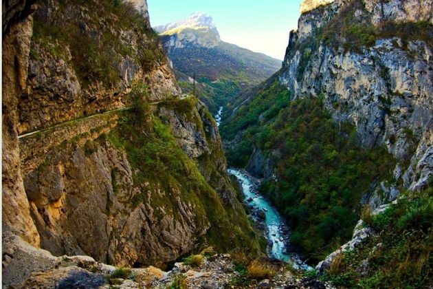 • Черекская теснина. Проехав знаменитые Голубые озера, мы попадём в теснину, прорубленную Череком Балкарским в горах Скалистого хребта. Над дорогой в буквальном смысле этого слова нависают скалы. В наше время в самых опасных местах проложены тоннели, а вот раньше неудачливый водитель на крутых виражах мог сорваться в бурлящий на глубине 200 метров Черек. Местные жители дали таким поворотам меткое название — «Пронеси, Господи».