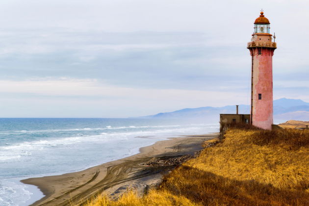 Затем отправьтесь к единственному песчаному мысу, где расположен маяк Слепиковского — последний из маяков, построенных японцами на острове.