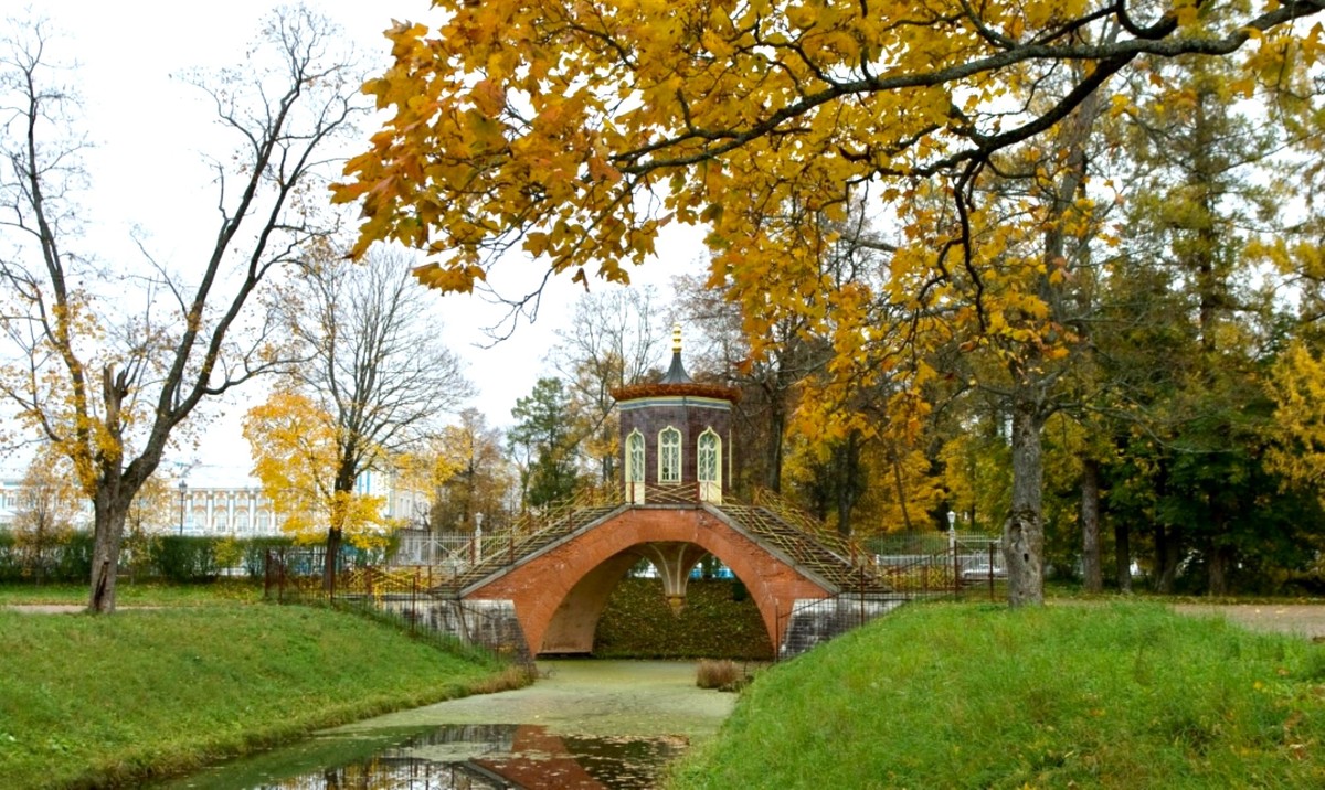 Роскошные интерьеры сменятся не менее шедевральным парком. Вы увидите здесь образцы архитектуры разных эпох — Камеронову галерею и Чесменскую колонну, Грот и Эрмитаж. Отыщете «хижину отшельника», узнаете, где Екатерина II любила выпить чашечку кофе и послушать военные марши.