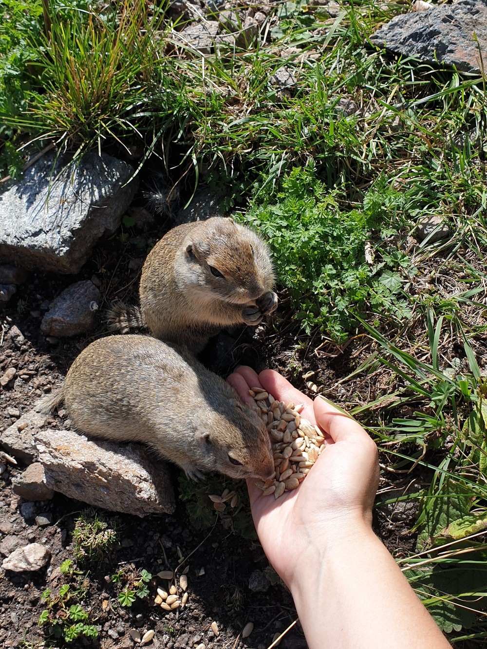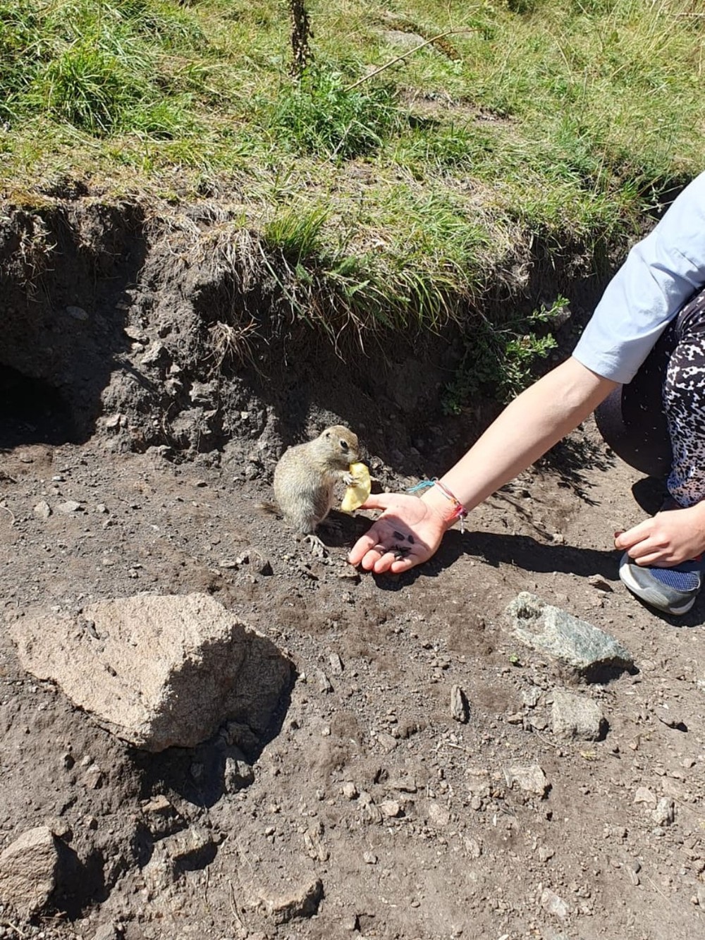 Мы отправимся на встречу с очаровательными зверьками — к самым высокогорным, неприхотливым и миролюбивым среди всех сусликов: кавказским или, как их ещё называют, горным эльбрусским. Нам не придется искать их на труднодоступных тропах или сидеть в засаде с биноклем в надежде поймать мгновенье, когда суслик выглянет из норки. На Джилы-Су они буквально повсюду, и, если внимательно присмотреться или обернуться на писк, можно везде увидеть стоящие маленькие столбики. Но мы отправимся к крупнейшей в Приэльбрусье колонии этих зверьков. От стоянки путь займет не более 7 минут — и мы окажемся в семье, где живет более сотни этих очаровашек. Людей они не боятся, поэтому вы сможете подойти к ним близко. Можно взять с собой гостинцы: морковь, яблоки, смесь для грызунов, но больше всего конкретно эти любят семечки.