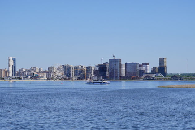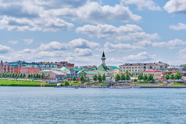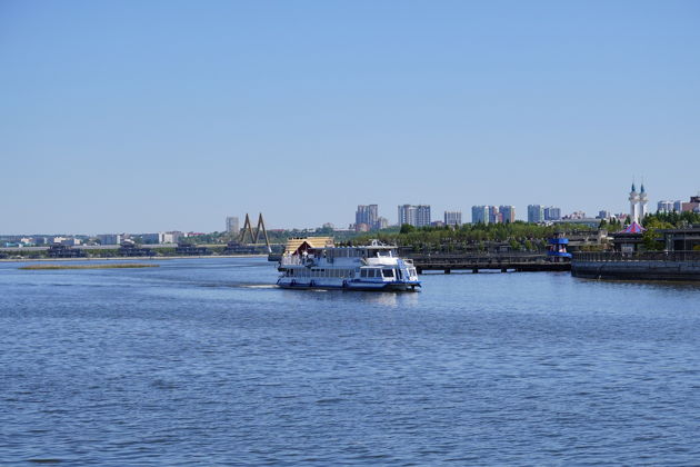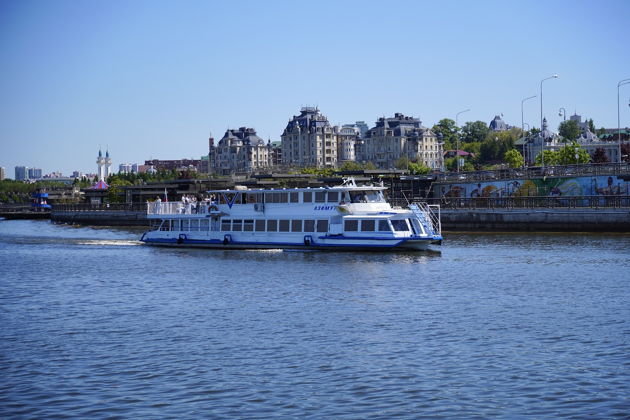 пройдете под двумя мостами: Кировским и Кремлевским вдоль стен древнего Кремля, любуясь силуэтом падающей башни Сююмбике и восточной красавицей мечетью Кул Шариф