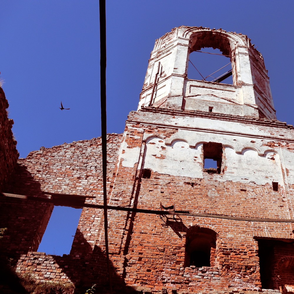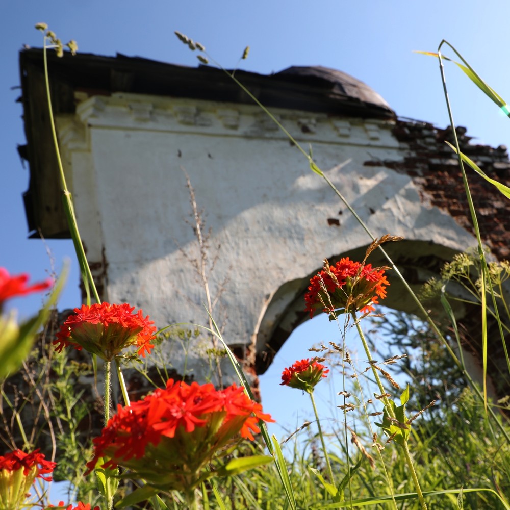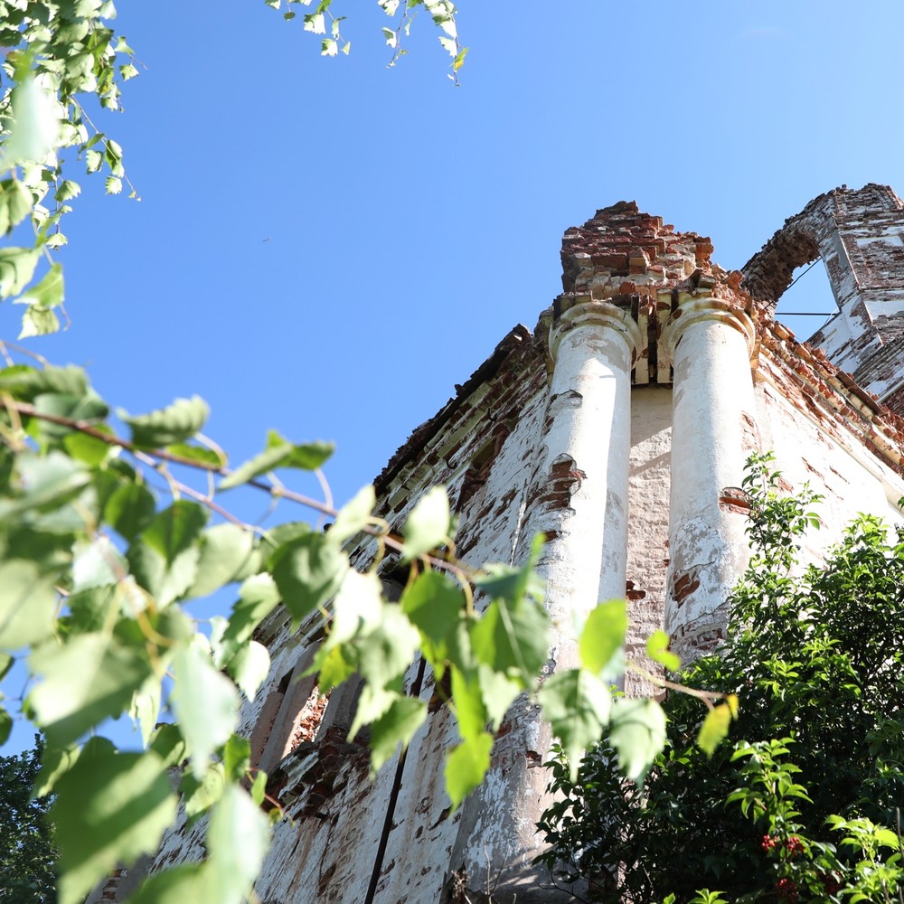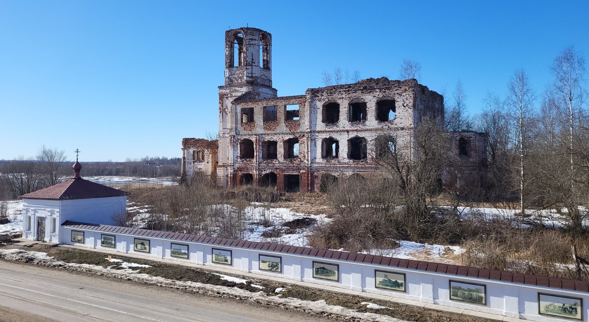 - Едем до Волокославинского, осматриваем село Никольский Торжок и руины заброшенной Благовещенской церкви — единственного культового сооружения России, где располагалась фабрика гармони. Храм стоит прямо на возвышенности, где начинался знаменитый древний волок (участок суши, обычно с перевалом между двумя озёрами или реками — прим.)