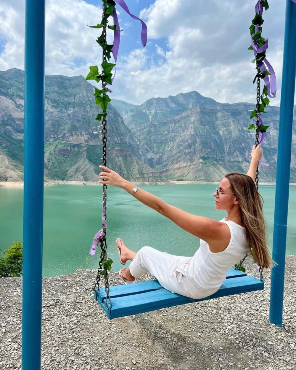 Сапбординг на фоне гор. Миновав головокружительный горный серпантин, окажемся у живописного Ирганайского водохранилища. Здесь вы сможете поплавать на сапах по прозрацной изумрудной воде в окружении горных вершин. А после мы прокатимся на тех самых качелях на краю обрыва — держите фотоаппараты наготове!