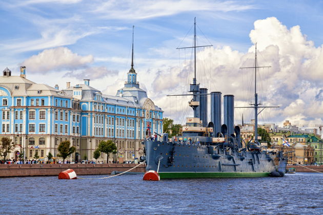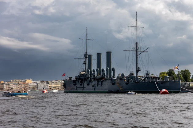 Крейсер Аврора с нового ракурса. В Большой Невке теплоход пройдёт у борта легендарного крейсера. Отсюда вы оцените его масштаб и сможете сделать кадры, недоступные с берега.