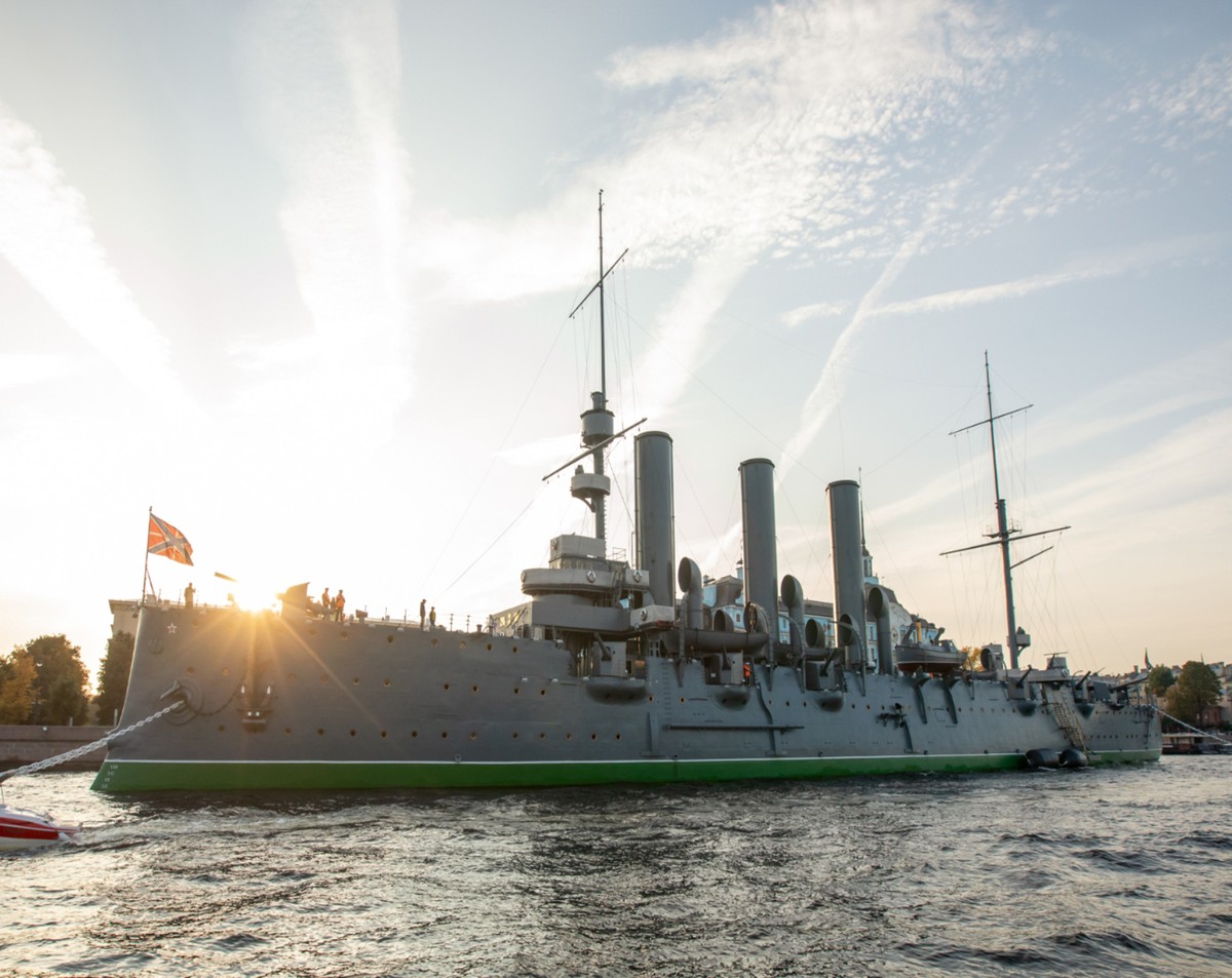 Крейсер «Аврора» с нового ракурса. В Большой Невке теплоход пройдёт у борта легендарного судна. Отсюда вы оцените его масштаб и сможете сделать кадры, недоступные с берега.