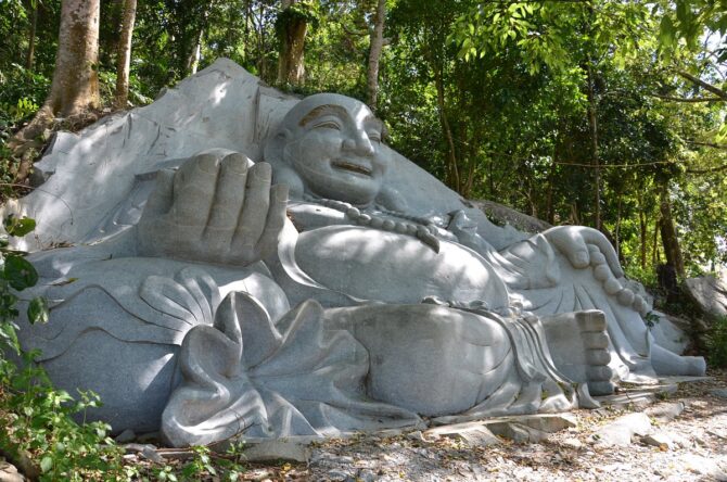 Гораздо позже, в 1966 г., в 50 м от пещеры, где жил Хуу Дук, закончилось возведение статуи лежащего Будды Шакьямуни. Автор проекта – Вин Тхо. Замысел был воплощен в жизнь Чыонг Динем и командой мастера. Статуя характеризуется следующими параметрами: