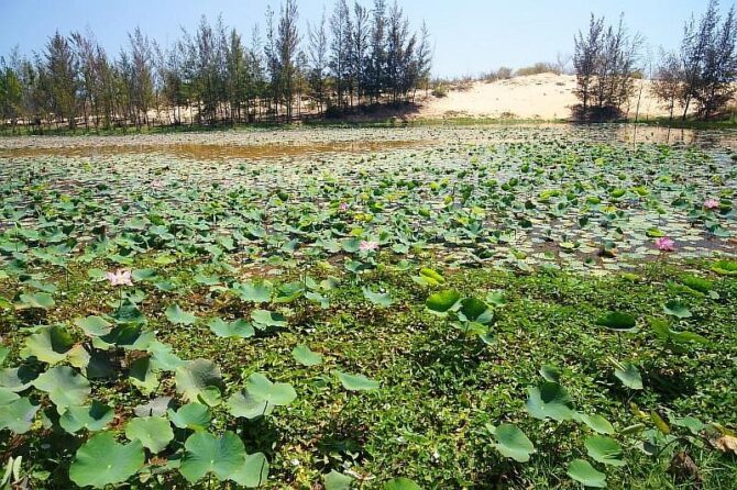 Рядом с Белыми дюнами расположено два пруда, соединенные между собой: Бау Транг и Бау Сен. Туристам водоемы известны как озеро Лотосов. Его общая площадь – 70 тыс. кв. м, глубина – от 5 до 19 м. Во второй половине лета и в начале осени озеро покрыто лотосами бело-розового цвета. Местные жители и активные путешественники приезжают сюда с тремя целями: